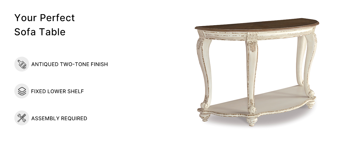 The Signature Design by Ashley Realyn Semi-Circle Console Table blends classic French country style with practical design. Measuring 48" W x 19" D x 30" H, it features a durable two-tone wood and veneer finish, a fixed lower shelf for storage, and sturdy cabriole legs. Perfect for narrow spaces, this indoor console table supports up to 250 lbs and comes with all necessary assembly tools and instructions.