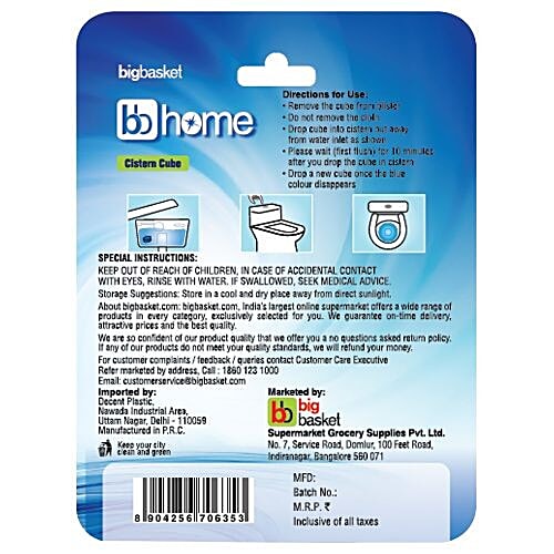 About the Product @import url("https://www.desercart.com/static/froala_style_v2.min.css"); BB Home Toilet Cleaner & Freshener Cube Block is the ideal product for your toilet hygiene. It deeply cleanses and keeps your toilet fresh. It is easy to use and can be clipped to your toilet bowl. Get a clean and tidy wash with every flush. How to Use @import url("https://www.desercart.com/static/froala_style_v2.min.css"); Remove the cube from the blister without removing the cloth. Drop the cube into the cistern, but keep away from water inlet as shown. Please wait for 10 minutes after you drop the cube in the cistern and then flush. Drop a new cube once the blue colour disappears.