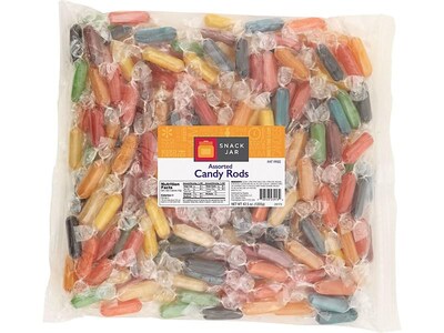 Description Give guests and staff a sweet welcome to your office with these Snack Jar assorted candy rods. Fill office treat jars and bowls with these assorted candy rods. A variety of classic flavors, including butterscotch, peppermint, and lemon, makes it easy to choose your favorite, and each piece is individually wrapped for easy sharing. Packaged in a 2.7-pound bag, these Snack Jar candy rods provide an ample supply for waiting rooms, break rooms, and other professional settings. Hard candy and lollipops are a perfect addition to any dessert table Everyday theme The product is fat-free 42.5 oz. of individually wrapped candies Assorted flavors include lemon, strawberry, pineapple, wild cherry, peppermint, sour cherry, tangerine, butterscotch, apple, and licorice Individually wrapped candies allow everyone to grab as much as they want Specifications Flavor : Assorted Sugar Free : No Candy Type : Hard Candy & Lollipops All Natural : No Kosher : No Gluten Free : No Fat Free : Yes Nut Free : No Dairy Free : No Low Fat : Yes Brand : Snack Jar Customizable : No Weight : 18.00 lbs. per Each