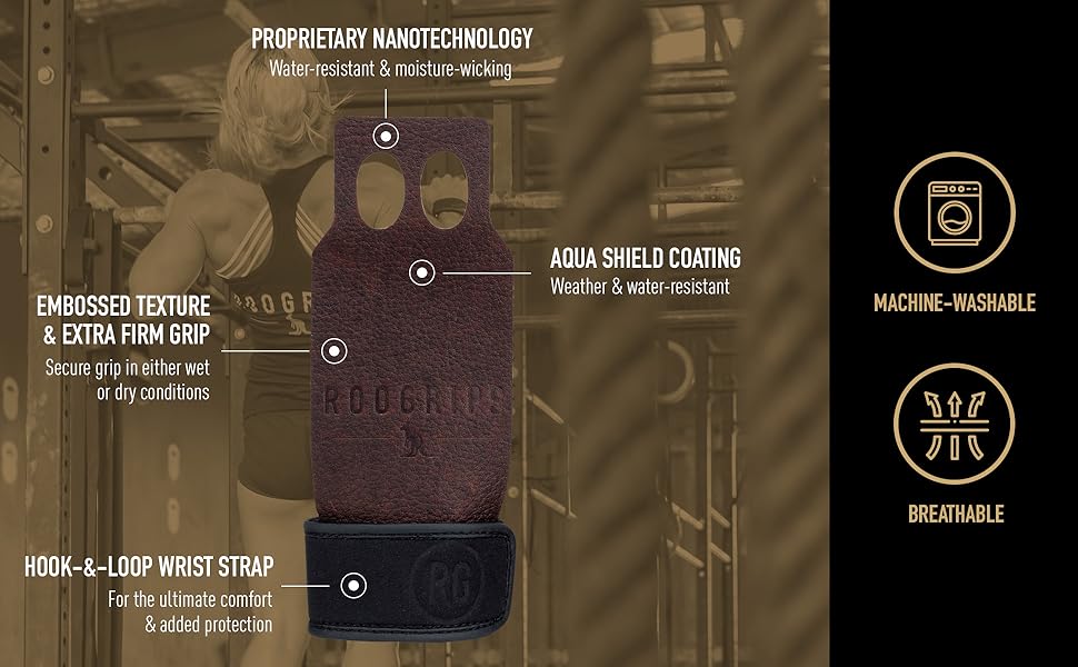 RooGrips 2 Finger Premium Leather Hand Grips combine ultra-durable, oil-treated leather with a water-resistant aqua shield for superior grip that improves with sweat. Designed for CrossFit, gymnastics, and weightlifting, these tear-resistant grips offer wider palm coverage and comfortable wrist support. Machine washable and competition-approved, they empower athletes to push harder without blisters or slips.
