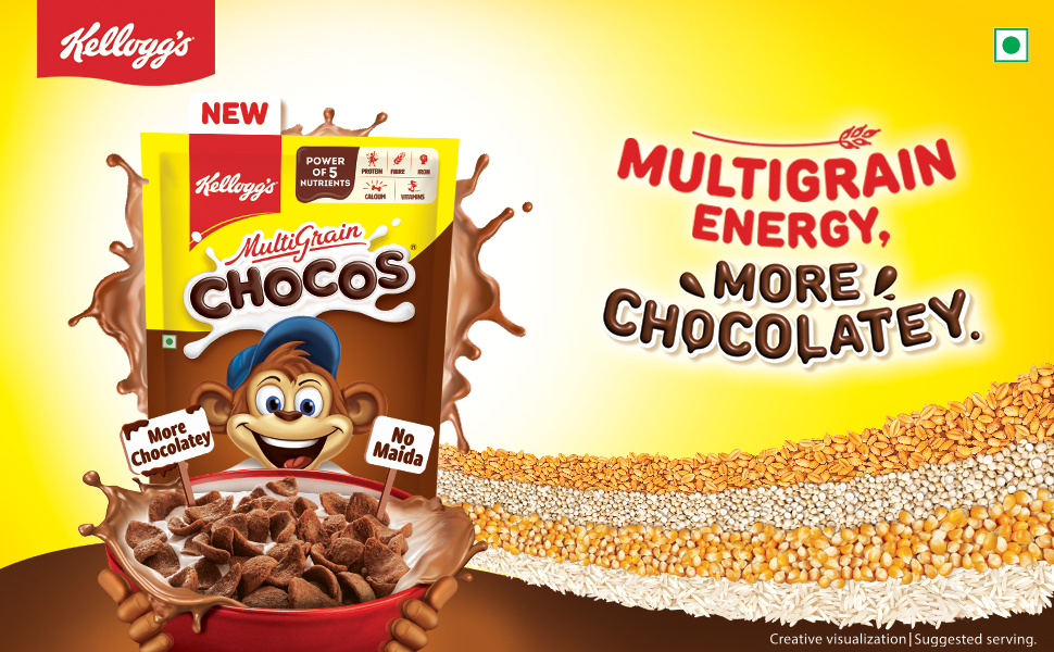 Kellogg’s Multigrain Chocos is a 385g kids’ breakfast cereal combining 64.8% multigrain flour mix with 5.3% cocoa solids, delivering protein, fiber, iron, calcium, and essential vitamins. Maida-free and free from preservatives and trans fats, it transforms milk into a delicious, nutrient-rich start to the day.