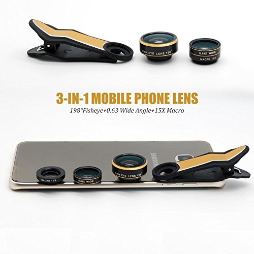 Features:Wide angle lens: Expands the native viewing angle by 2X, suitable to take picture of large ranges, such group of people, buildings and landscapeFish Eye Lens: Can see the image with the range of 198 degree from the right to the left on your phoneMacro: Use the 15X Macro lens to zoom and show details unseen to the naked eyePortable and detachable, take photo with your devices at anytime and anywherePlease Note:1. The Macro lens and the Wide-angle lens are attached together upon receival. When you use the Macro lens, please detach the Wide-angle lens from the Macro lens.2. The optimal distance of taking pictures with the Macro lens is 0.4-1 inch. If your camera can't focus with the macro lens on, then move the whole thing closer to your object.3. The Flash Light might be blocked when the lens is in use.Package Included: 1 x Fisheye Lens 1 x Wide Angel Lens1 x Macro Lens (Detach from Wide Lens)1 x Universal Lens Clip2 x Lens Cap1 x Carrying Bag