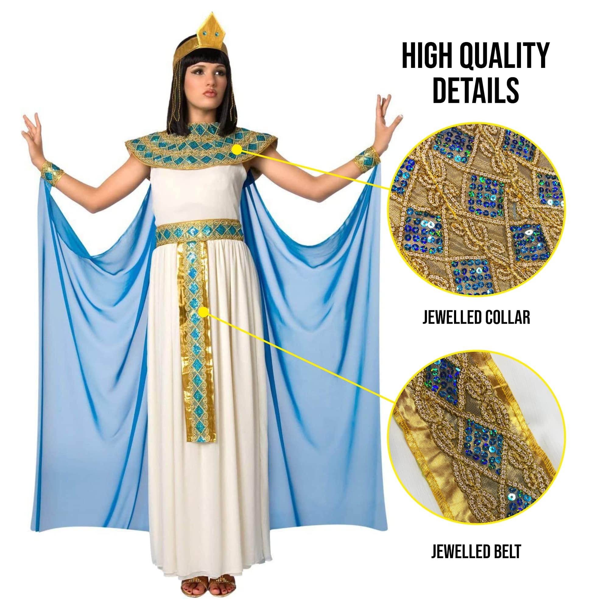 Adult Cleopatra Costumes for Women includes jewel-belted dress, jewelled collar, cape, beaded headpiece & two jewelled wrist cuffs. Easy to wear Cleopatra costumes for women, durable and soft material ensures a great comfortable fit that lasts more than one wear, intricate details make this costume perfect for Halloween. Egyptian Womens Costume available in sizes; Small, Medium, Large & X-Large. For more information please see size guide. Founded in 2009 by 3 friends with a passion for costumes, we now have 100s of designs all manufactured to high standards of quality, fit and design. We have offices in the US, UK and Europe. Perfect for Halloween parties, Cleopatra womens costume, Egyptian custom women, Egyptian costume women Cleopatra, womens Egyptian costume, adult Cleopatra costume, Cleopatra costume adult, Cleopatra custom for women, Costumes for women Cleopatra