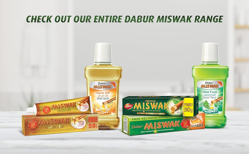 Dabur Miswak Mint Fresh Mouthwash is a 250ml alcohol-free oral rinse enriched with natural Miswak and mint extracts. It effectively fights germs, prevents plaque buildup, and promotes fresh breath and healthy gums without any burning sensation, making it ideal for daily use by adults seeking a natural and refreshing oral care solution.