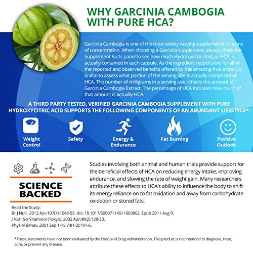 The BEST and Most Trusted GARCINIA CAMBOGIA BRAND ON AMAZON Our SUPER PURE Garcinia Cambogia Extract is standardized to 60% HCA, the same concentration used in clinical trials - and we can back it up! Many other brands do not employ the strict third party testing and GMP manufacturing standards that Abundant Health simply insists on, nor are they prepared to provide documentation to back up their claims. We believe in supplying you with a product that we KNOW contains exactly what you need to achieve your goal weight - and nothing you don't! A healthy weight is just ONE component of your overall wellness, so we have meticulous crafted a formula that is Non-GMO and completely free of fillers, potentially harmful additives, gluten, trans fats, soy or lactose, chemical preservatives, and artificial colors or flavors. This means you get all the goodness and none of unwanted side effects. CUSTOMIZEABLE SUPPORT FOR YOUR WEIGHT LOSS JOURNEY We include a large 180 capsule supply in every bottle and have formulated our serving sizes to allow an adjustable usage schedule. New to Garcinia? You have enough supply to ease yourself in, listen to your body's needs, and identify the regimen that is best for YOU. Experienced with Garcinia? You have a FULL month supply at a huge 3,000mg daily! Combined with a healthy diet and exercise, Garcinia Cambogia can help you reach your goal weight sooner. Among weight supplements, Garcinia is uniquely non-stimulating, and actually has mood boosting effects, helping you keep the positive, motivated mindset you need during your weight loss journey! Try today, RISK FREE! Every purchase is backed by our 1 YEAR MONEY BACK GUARANTEE. If you are NOT FULLY SATISFIED, for any reason, we will refund your money, no questions asked. Click the Add to Cart button above to start - or super charge -- your weight loss journey TODAY!