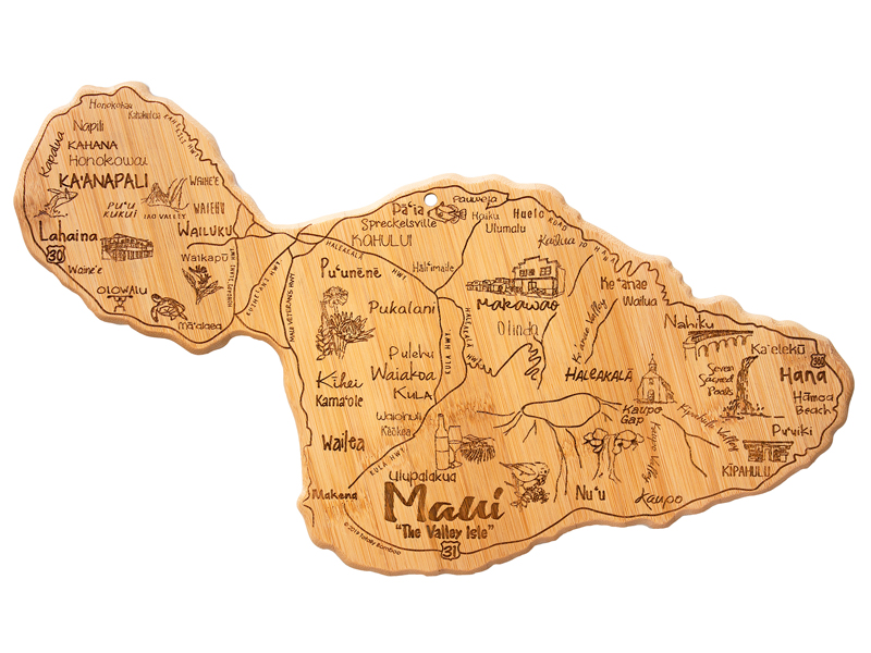 The Totally Bamboo Destination Maui Serving and Cutting Board is a beautifully crafted bamboo board shaped like Maui, featuring whimsical laser-engraved artwork that highlights the island's iconic sights. Measuring 15.5" x 8.88", it serves as both a functional cutting surface and an eye-catching serving platter. With an eco-friendly design and a convenient hanging option, this board is perfect for those who cherish island life and sustainability.