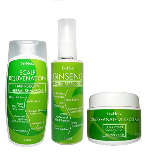 Product details of EcoHerbs Ginseng Extra Strength Package Value Complete Set For Hair Growth & Hair Loss/Hair Thinning (For beginning, serious & critical hair loss or near bald) -(Green) The EcoHerbs Ginseng Extra Strength Package Value Complete Set gives you the full experience & treatment in treating the root cause of your hair loss/hair thinning & hair growth problems. It consists of 3 items: · Ginseng Extra Strength Serum · Hair Re-born Scalp Rejuvenation Herbal Shampoo · Pomegranate VCO Cream What It Does For You: · Stops hair loss/hair thinning · Stronger, shinier, thicker hair · New baby hair re-growth · Stimulates new hair follicles · Add thickness and fullness and ending scalp show through · Nourishes hair structure to remain vibrant, bouncy, fresh & healthy