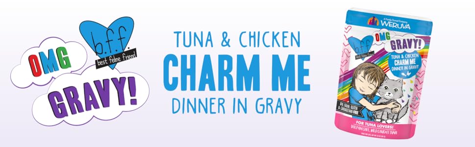B.F.F. OMG Tuna & Chicken Charm Me is a 3oz pouch cat food pack of 12, featuring cage-free chicken and red-meat tuna in a savory gravy. Grain-free, gluten-free, and free from artificial additives, itâs produced in human-grade facilities under strict global standards. This complete and balanced diet supports all life stages with added vitamins, minerals, and antioxidants, ensuring your feline friend thrives with every delicious bite.