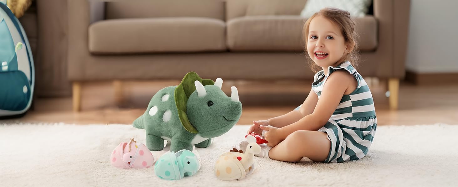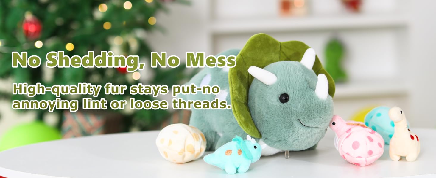 This 17.6-inch plush dinosaur set features a mommy dinosaur and three baby dinos—Triceratops, Stegosaurus, and Diplodocus—each nestled inside colorful dinosaur eggs. Made from high-quality polyester fiber and filled with soft PP cotton, these cuddly companions are designed for kids of all ages, perfect for play, snuggling, and decoration. Ideal as a thoughtful gift for holidays or everyday joy, backed by responsive customer service.