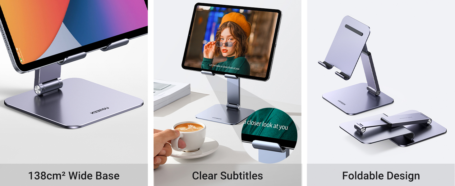 The UGREEN Aluminum Tablet Stand is a premium, foldable desk mount designed for 4.7” to 12.9” devices. Featuring ultra-durable hinges tested for 3000 rotations, it offers smooth multi-angle adjustments from 5° to 150°, supporting up to 1000g. Its wide aluminum base with silicone pads guarantees stability and scratch protection. Compatible with a broad range of tablets and phones, it’s the perfect ergonomic solution for professionals seeking comfort and efficiency.
