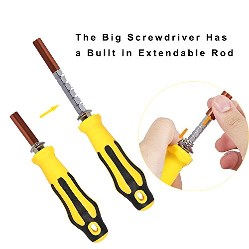 Specificities : Material : S2 Size : 20.5x14x4.5 cm Weight : 850gr Color : Yellow and black Package contents: 1x of 70in1 screwdriver kit •2 x Screwdriver handle •1 x 123 mm Extendable Reed •1 x Pry bar •1 x 60 mm Hard extension bar 65bits •7 x driver metric socket 4mm (5/ 32 inch) (M2.5, M3.0, M3.5, M4.0, M4.5, M5.0, M5.5) •9 x driver metric socket 6.3mm (1/ 4 inch) (M5.0, M6.0, M7.0, M8.0, M9.0, M10.0, M11.0, M12.0, M13.0) •7 x Torx bits (4mm - T3, T4, T5, T6, T7 / 6.3mm - T6, T10) •8 x Torx Security bits (4mm - T8, T9, T10, T15, T20 / 6.3mm -T15, T20, T30) •8 x Slotted bits (4mm-1.0, 1.5, 2.0, 3.0, 4.0 / 6.3mm-5.0, 6.0, 7.0) •8 x Phillips bits (4mm- PH000, PH00, PH0, PH1, PH2 / 6.3mm- PH1, PH2, PH3) •10 x Hex bits (4mm-H0.9, H1.3, H1.5, H2.0, H2.5, H3.0, H4.0 / 6.3mm- H4, H5, H6) •3 x Y model bits (4mm-Y2.0, Y2.5 / 6.3mm- Y3.0) •1 x U model (4mm-U2.6) •1 x O model (0.8) •1 x Triangle model (2.0) •1 x Pentalobe (five point star )model (0.8) 1 x 6.3mm magnetic connector Description: This tool box contains everything you need to repair your electronic devices, smartphones, (iphones, samsung, ...) all kind of tablets (ipad...),laptop,computer, video game device and other small electronic device. All the necessary tools to repair with precision without damaging any piece. You can build your furniture and work on your DYI projects easily. No need to rush to the repairman,you can do everything at home,repairing,changing pieces or assembling.