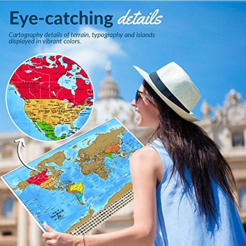 Scratch Your Path Across The Globe with this large world map poster. Printed on premium quality laminate paper with a gold foil layer covering the countries of the world. The paper has been further reinforced with an acrylite front protector for an impressive finish. Using a coin, simply scratch off foil to reveal vibrantly colored US states, territories, islands, countries and corresponding flags. An easy and fun tool to keep track of all your travel adventures! An awesome keepsake for the backpacker, frequent flyer, retired couple, or newly weds. A novel way to learn, record and relive travel experiences. Why bother with tons of expensive souvenirs that end up being boxed away, when you can have this charming foil map of the world to remind you of all the places you've visited? Educational too, this large scratch off atlas makes an invaluable and interactive tool in any home or classroom. Kids love anything hands on. The novelty of being able to scratch off a state or country will resonate with children better than through learning facts out of a textbook alone. And, this awesome scratch globe is just the beginning. You're giving them a taste for knowledge. Once they discover a country/island they've never heard about they'll probably want to know more. How's your own geography? This tasteful scratch off foil map is also an aesthetically pleasing piece of functional wall art that makes a welcome addition to both contemporary or classic style decor. Frame and hang up this map-with-a-difference in your home or office for a striking focal point. Fade-resistant and durable, the stimulating colour scheme will instantly cheer up any wall space. Your personalized scratch off map comes in elegantly designed, recyclable packaging. The eco-friendly cardboard tube is perfect for carrying along on trips or for presenting as a gift.
