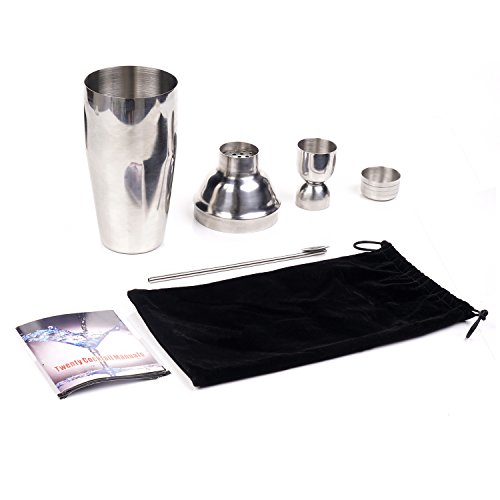 Martini Cocktail Shaker for All Your Cocktail Mixing Needs* Enhance Your Cocktail Creation Process Now!How to use the Cocktail Shaker Set to get the most out of it!Step 1 - Prepare your cocktail recipe from the included booklet.- Pour all the ingredients into the mixing section of the cocktail shaker, using the jigger.Step 2 - Add ice to the mixing section.- Ice is filled so that the mixing section is 2/3 to 3/4 full.Step 3 - Put the lid with the built-in strainer on top of the mixing section.- The small lid is placed on top of the strainer.Step 4 - Tap the top of the shaker with the palm of your hand to seal it tight.- Make sure its sealed well.Step 5 - Hold the shaker in both hands, with one hand on top and one supporting the base.- Shake well for 10 to 20 seconds.Step 6 - Remove the small lid and pour the drink through the strainer into a chilled cocktail glass and- Enjoy your cocktail!Package Included700 ml TIN which is about 2-3 drinksThe Double Size Jigger will help you to measure your beverages. One side measures 0.7 oz / 20ml capacity, the other side measures 1.4 oz / 40ml capacity. You will now being pouring the exact amount and not wasting your liquor.The Twisted Bar Spoon is a must-have for the home bar and is perfect for use with the cocktail shaker, tall glasses or pitchers. It's great for mixed/layered cocktails and will become an essential part of your barware tools.An Illustrated Guide to Cocktails includes an assortment of delicious cocktail recipes. So whether you are just getting started or you are a seasoned professional, you will have a helping hand in making the most delicious tasting drinks.A Bag For Storage