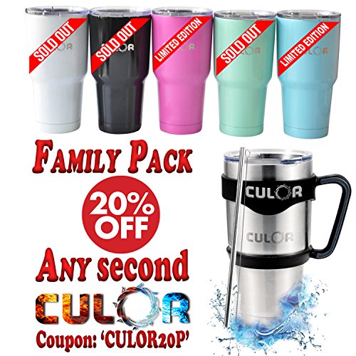 Your Next Stainless Steel Insulated Travel Tumbler Is Here To StayDo you like enjoying your drinks at exactly the perfect temperature? Are you sick of spending a fortune in coffee shops just to enjoy a half-decent cup of coffee or a glass of juice in the middle of your day? Would you like to pack your own drinks and enjoy them all day long? CULOR may just have exactly what you've been looking for! With this Tumbler 30oZ you will get: ♥ Unique 304(18/8) Stainless Steel, Sweat-Free design & WITHOUT METALLIC TASTE Tumbler ♥ Grip Handle(fits Rtic & Yeti tumbler) ♥ Reusable S\S Straw ♥ Cleaning Brush ♥ Clear Sliding & Splash-Proof Closing lid Perfect Temperature With Every Sip - For Hours On End! Forget plastic cups, glass tumblers, one-time straws, metallic flasks, canteens or any other kind of conventional drink containers. These amazingly crafted stainless steel travel mugs will keep your water, coffee, tea, juice or any other drink at the ideal temperature! Their double wall vacuum insulation design ensures minimal heat exchange between the contents of your travel drink container and the environment. This also means that no condensation will form on your stainless steel tumbler's exterior. They are easily cleaned , and will last you a good long while! Travel Tumbler Bundle - All The Bonus Accessories You Could Ever Need! CULOR's stainless steel insulated drink mug bundles contain a slew of handy accessories straight out of the box, free of extra charge! Whether you want to enjoy a drink to-go or you want a great insulated cup to use at home, you will come to love these traveling and kitchen essentials - and that's a promise backed by lifetime satisfaction warranty! So Don't Squander It - Order Your Travel Mug Now! Just Click 'Add To Cart!'!