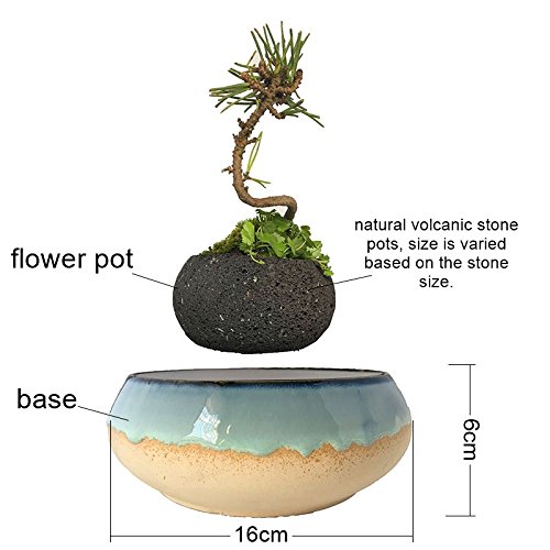 How to operate? 1. Please place the base on an absolutely horizontal surface. 2. Hold the flowerpot with two hands and put fingers under the flowerpot to hold the flowerpot tightly. Move the flowerpot vertically downwards the center of the base.3. Make the flowerpot approach the center of the base slowly, please move it around, left and right, front and back to reach the levitating point. 4. When you feel a strong force which is holding the flowerpot from the base, this position is the right levitation point. Release the flowerpot gently. 5. When watering, take down the flowerpot and water on the desk. put it back on the base after a while. if the base get wet, please dry it. 6. The maximum floating weight ( including flowerpot and plant) is 400g, suit for small plants. levitating height is influenced by floating weight, the levitating height is lower if floating weight is heavier.