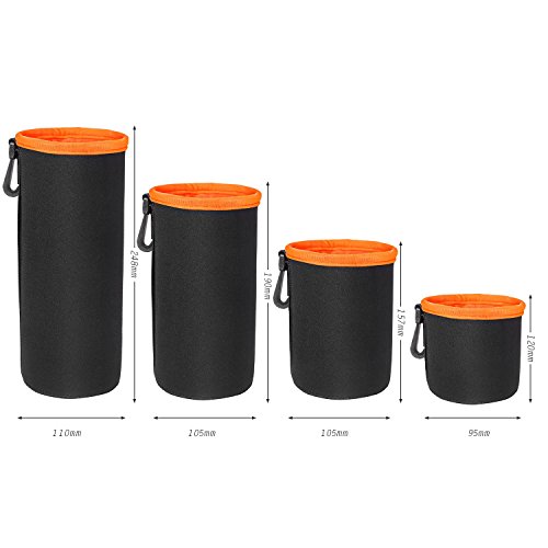 Accevo Lens Pouch have superior quality of water-resistant Neoprene on the exterior and super-soft velvet lining, excellent features of wear resistance and shock absorption, provide thorough protection for your lens. Compatible with lenses of Canon, Nikon, Olympus, Fuji, Pentax, Panasonic, Sony, Leica, Sigma, Tamron, Vivitar, Minolta, Mamiya, Yashica, Kodak, Konica, Hasselblad, Ricoh, Zeiss & lens baby etc. Dimensions: - S: 10cm x 7cm(height x inner diameter) - M: 14cm x 9cm(height x inner diameter) - L: 17cm x 10cm(height x inner diameter) - XL: 24cm x 10cm(height x inner diameter) Package Contents: 1X Small size lens bag 1X Middle size lens bag 1X Large size lens bag 1X X-Large size lens bag
