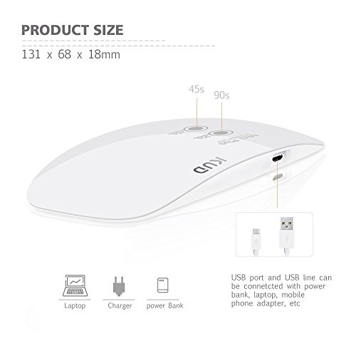 Features Suitable for curing all kinds of UV and LED nail gel polishes 5pcs durable LED light beads, no need to replace any light bulb 5W UV/LED lamp cures fingernails or toenails in many ways Closer white light protects your hands and eyes, avoiding harm from outdated nail dryer 2 Timer Settings: 45s, 90s Mini size best for travel and business trip 18-month warranty and friendly, easy-to-reach support Specifications Brand: KUD Type: Nail Nursing Tool Model: SUNmini Material: PC & ABS Color: White Power: 5W Wave Length: 365nm + 405nm Fit Gel Type: UV nail gel polish/ LED nail gel polish Service Life: Approx. 50000 hours Delay time: 45s/90s Dimension & Weight Item Size: Approx. 131* 67* 19mm/ 5.2 * 2.6 * 0.7in (L * W * H) Item Weight: Approx. 56.5g / 2.0oz Total Size: Approx. 135* 90 * 25mm / 5.3* 3.5 * 1.0in (L * W * H) Total Weight: Approx. 90.0g / 3.2oz What's You Will Get 1x Nail Lamp 1x User Manual 1x USB Line Tips: The power adapter does not included in accessory list• Warranty and Service: 45 days money-back, worry-free 18-month warranty and friendly customer service.