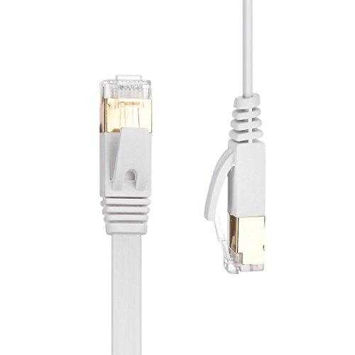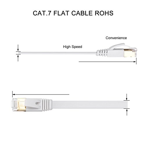 Fast & Max Performance, Especially for Movie or Gaming -The latest CAT 7 ethernet cables support the bandwidth up to 750MHz, 8Gbps high speed data transmission, much faster than Cat 6a Ethernet cable. No more worry about jam, whatever you watch movie or play the game online, download or upload the big file. Interference Elimination - Each twisted pair STP of copper wires is shielded with Aluminum Mylar Foil, efficiently provides better protection from crosstalk, noise, and prevent from interference & transmission damping. RJ45 Connector with Gold Plated -The gold plated finishing conductors in each RJ45 connector ensure the contact is durable and stable. Flat & Slim(2.3mm thickness), Space Efficient & lightweight -Emmaky flat network cable is flat and slim, so that the cable layout can be hidden under the carpet on the floor without raising it. Keep the floor smooth and brings about consistent electrical characteristics. -Light weight, roll it up compactly and easily carry when traveling. Features and Specs Inner Conductors: Pure Copper 32AWG STP Cat 7 Cable Shield: Single Shielded Twisted Pair with Aluminum Mylar Foil Plus 85% Tinned Outer Jacket: PVC Bandwidth & speed up to 750MHZ ,8GB/s Connector Copper with Gold Plated RJ45 Male to Male Warranty Limited 1 Year Warranty Notes -Network speed is determined by many factors,such as the cable, router, switch boxes, other network components, and also service provider.
