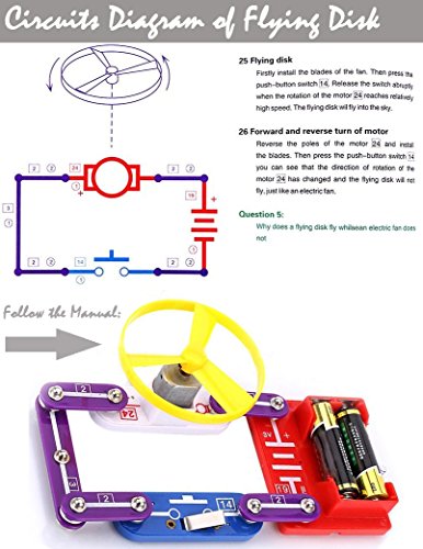 * LINKW Electronic kit is a great start for introducing kids to basic electronics ,cool experiments and electrical circuits. It makes kids imagination go free with creativity.* LINKW Electronic Discovery kit is very easy to use with the manual guide where it describes what colors and numbers to use on the clear pad to create different electrical gadgets such as a fan, a light source, a buzzer and so much more. * The projects in the manual start off basic and gradually become more complicated but not overly so. * The Electronic Discovery Kit is with integrated circuits (chip) so kids can set it up to play music. * Everything pops on and off for easy use. The bottom inside of the box has a pictured page enabling kids to easily place everything back for storage. * There are two options for the fan: >>Connect it one way and the fan becomes a helicopter flying around the room! >>Connect the other way and it stays put.