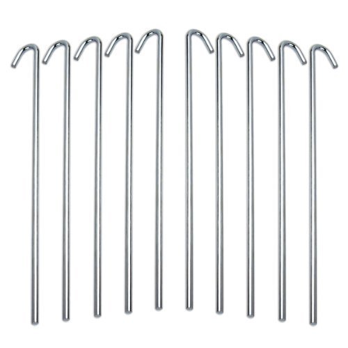 Perfect for anchoring tents, canopies, tarps, landscaping or garden plants;4mm diameter steel rod with galvanized finish for superior rust-resistance;Lightweight strength - each peg weighs just 1 ounce - great for camping;9 length with 1 hook for attaching rope or for anchoring;Sold in sets of 10 pegs