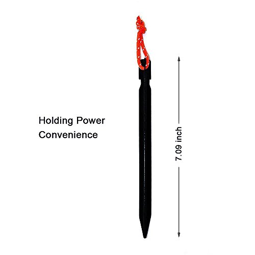There is nothing worse than pulling out your bag of old tent pegs to find out that they are all bent and mis-shaped. With our tri-beam ground stakes you don't have to worry about that problem! You might as well get the best and forget how to beat tent pegs back into shape! Product Description: Size: 18cm x 0.6cm/7.09'' x 0.25'' (approx) Net weight:12 gram/piece. Color: Black Length: 18 cm Package Included: 10 X Tent Stakes 1 X Tent Pegs Bag 4 X Rope Tensioners