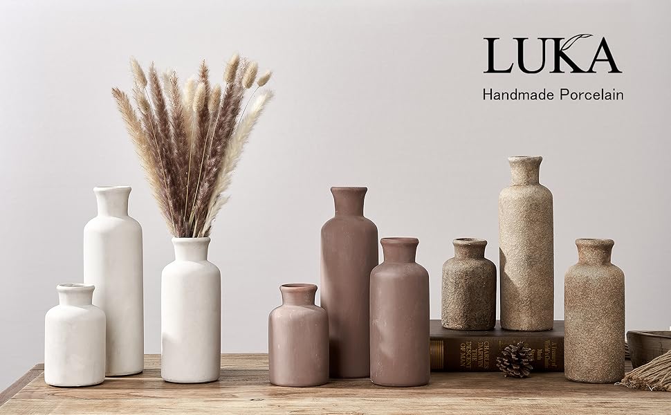 The LUKA Ceramic Rustic Farmhouse Vase Set includes three terracotta vases in graduated sizes (10.6", 7.8", 5.3"), crafted from 100% ceramic with a glossy finish. Designed to enhance modern farmhouse, boho, and rustic interiors, these versatile vases are perfect for displaying faux flowers or standing alone as statement decor pieces across living rooms, offices, fireplaces, and more.