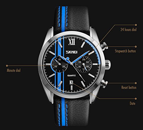 Product Description: Material:Zinc Alloy Case;Leather Strap;Thickened Hardened Glass Mirror;Stainless Steel Bottom Cover;Stainless Steel Buckle Size:265mm Movement:Quartz Movement Weight:130g Color:Blue Packing:In Box Note: 1.Please note all the size and color may have a little deviation by manual measurement and display screen. 2.Not suitable for swimming, diving, shower,etc. 3.Do not operate any buttons when the watch in water.