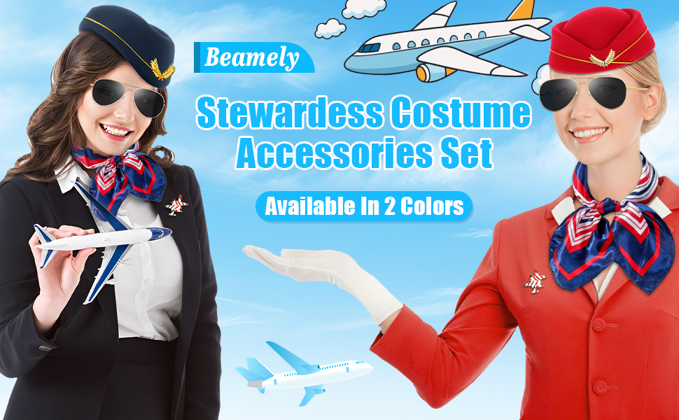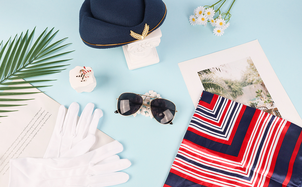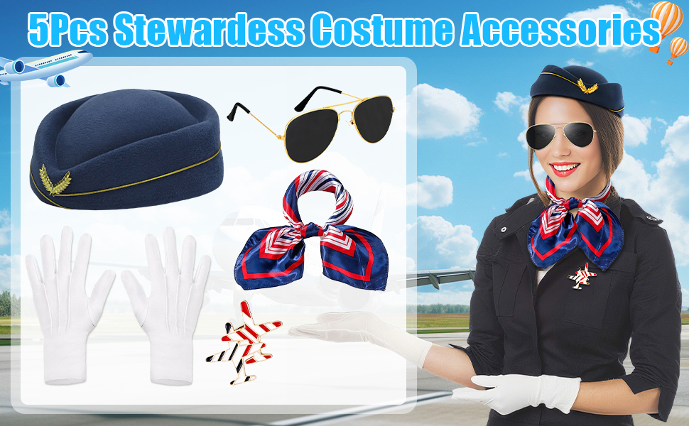 5Pcs Airline Stewardess Costume Accessories Set, Flight Attendant Fancy Dress Kit with Stewardess Hat Scarves Brooch Sunglasses Gloves Cosplay Outfit for Adults Girls Cosplay Dress up Party