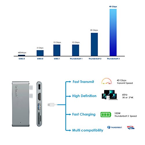 Features· Thunderbolt 3 supports data transferring speed up to 40Gbps (5k or 2x4k @ 60Hz)· USB-C power delivery (PD 3.0) at full speed for Macbook Pro· HDMI signal 4k* 2k at 30Hz or 1080P at 60Hz. High-resolution video to your 4k monitor screens.· USB 3.0 port, fast enough to transfer high-definition videos, movies or data files in just few minutes (data transmission rate is up to 5G bps).· SD/TF card reader, quickly to read and transmit, support memory card models:SD/TF/SDHC/SDXC.· Expansion design, ideal for Macbook Pro users who want to connect mouse, storage devices, phone and other USB devices to new Macbook Pro that only with dual Type C port.Compatible DeviceMacBook Pro with Dual Thunderbolt 3Thinkpad X1 Carbon2017Supporting Operation SystemMAC OS 9.X, 10.X. Win7/8/10 XP OS VistaSpecificationsBrand: LeTouchColor: Space greyMaterial: Aluminum alloy housingDimension: about 90mm*42mm*12mm (L*W*T)Weight: about 88.5gInput: 5.2V-2.4AUSB A Output: 5V-900mAUSB PD (3.0): 9V-3A,20.3V-3A ,20.2V-4.3APackage Content1* 5 in 1 USB C HubNote1.Although the latest PD chipset is in use, still there's heat that generated while charging.2.Please don't use SD card and Micro SD card slots at the same time. By default computer will read the first card when inserting both at same time.3.When connecting the mobile hard disk or external drive to USB Type-C Hub, please make sure to plug in external power.