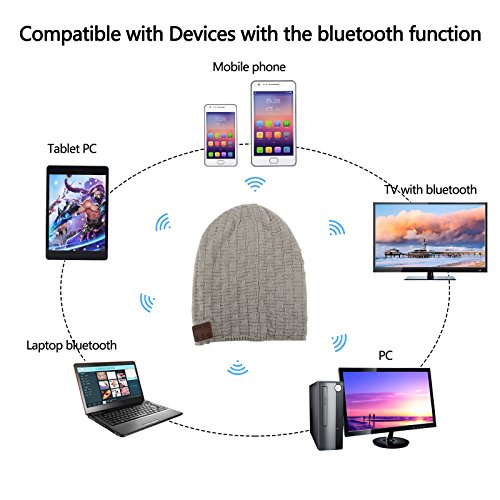 This handsfree Bluetooth hat utilizing Bluetooth V3.0 allows you to enjoy your favorite music and answer the phone call without having to wear additional headphones, fitting well to keeps your head warm and doesn't slip off while running, skating or dog walking.Features:1. This Bluetooth hat cap needs charging about 2.5hours and works about 3.5hours continuously.2. It can be paired with your devices with Bluetooth function easily. And the sound is very clear without any noise.3. It keeps your head warm and allows you to listen to your music without wearing additional headphones.4. Made of thin and soft material, it fits well. No more ear buds constantly falling out of your ears, or worse giving you an earache.5. The headphones and battery can be removed off if you want to wash the Bluetooth cap.Specifications:-Bluetooth: V3.0+EDR-V4.2+EDR-Frequency: 2.402GHz-2.480GHz-Transmission Distance: 10M or so-Transmission Distance of Mic: ≤1M-Li-ion Battery: 3.7V/100-200 mA-Charging Time: 3-8 HRS-Stand-by Time: 60-180 HRS or so-Continuous working Time: 3.5 HRS or soNote:Monitors are not calibrated same, item color displayed in photos may be showing slightly different from the real object. Please take the real one as standard.Package Included:1x Bluetooth Music Hat1x Charging Cable1x Instruction Manual