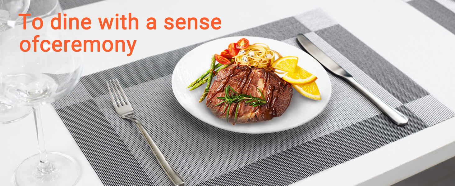 This set of 6 silver-grey placemats measures 18x12 inches each, crafted from durable woven vinyl with a double cross weave for strength and flexibility. They are heat resistant, non-slip, stain resistant, and easy to clean by wiping or rinsing. Perfect for protecting tables during everyday meals or special occasions, these versatile mats suit indoor and outdoor use, adding a modern touch to any dining experience.