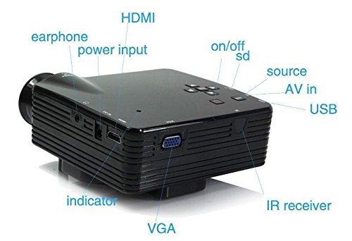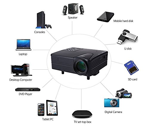 Display Technology: 2.4" Single LCD Panel Display Native Resolution: QVGA (320 x 240 Pixels) Support 1080p Brightness:400ANSI LM Contrast Ratio: 100:1 Aspect Ratio: 4:3/16:9 Displayable Colors: 16.7 million Light uniformity: 90% Projection Method: Front Keystone Correction: NA Projection Image: Image support horizontal and vertical flip Standard lens: 3pieces of glasses len Manual Zoom/Manual Focus Lens Specifications: F=150 Image Size (Diagonal): 18"~150" Projection Distance: 0.97M~7m Lamp Life: More than 30,000 hrs life VGA / Component Input:1 x VGA / Component Input HDMI: 1*HDMI USB: 1*usb SD: 1*SD Video: 1*AV Audio frequency: 1* 3.5 stereo YPbPr component video: NA S-video (4-pin mini DIN): NA TV: 1*TV optional Power: 1*12V Power Speaker: 8Ω 2W*2 Noise Level (STD/Bright): Language: Chinese,English,Spanish,French,German,Italian,Russian,Japanese Power Supply: DC Input 12V 2A Power Consumption: 24W working voltage: 90-240V/50-60Hz Operating Humidity: 20 - 90% RH Product Color: Black, White Accessories: video cable*1 power adapter*1 Remote control*1 User Manual *1 Product Size (mm): L127 x W135x H59mm BOX: 253*183*105MM Net weight/Gross weight: 0.85kg