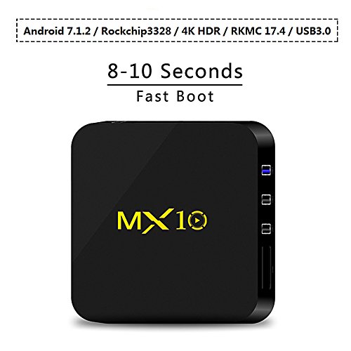 Hardware: Chipset: RK3328 Quad-Core 64bit Cortex-A53 GPU: Penta-Core Mali-450 Up to 750Mhz+ OS: Android 7.1.2 Memory: 4GB DDR4 Flash: EMMC 32GB WiFi: 2.4G 802.11 b/g/n Main Features: Support Decoder format: 4K VP9 Video decoder, H.265/H.264 video decoder; 1080P other video decoders (VC-1, MPEG-1/2/4, VP6/8) Support MediaL format: Avi/Ts/Vob/Mkv/Mov/ISO/wmv/asf/flv/dat/mpg/mpeg Support Music format: MP3/WMA/AAC/WAV/OGG/DDP/HD/FLAC/APE Support Photo format: HD JPEG/BMP/GIF/PNG/TIFF HDR: HDR10 and HLG modes USB host: 1*High speed USB 3.0 3*USB 2.0 Card reader: SD cards HDD file system: FAT16/FAT32/NTFS Support Subtitle: SRT/SMI/SUB/SSA/IDX+USB High Definition video output: 4K (4096x2160 pixel) OSD type of languages: English/French/German/Spanish/Italian etc multilateral languages LAN Ethernet:10/100 standard RJ-45 Mouse/ Keyboard: Support mouse and keyboard via USB; Support 2.4GHz wireless mouse and keyboard via 2.4GHz USB dongle HDMI: HDMI 2.0a for 4k@60Hz 3D: 3D video formats AV: Support Other feature: Free Internet searching, thousands of android applications, many kinds of games, etc. Dimension: 4.72"*4.72"*1.10" or 120*120*28mm Net Weight: 1.41oz or 400g Color Box Dimension: 5.12"*5.12"*3.15" or 130*130*80mm Accessories: 1* Power adaptor 1* HDMI cable 1* User manual 1* IR Remote