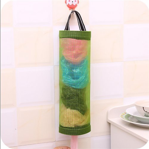 Material: Polyester. Features: Fastness and reusable. Could be used to store the plastic bags or for other purpose. Easy for hanging, in great convenience. Size: 39.5x10.5cm/15.6"x4". Package included: 1 x green garbage holder