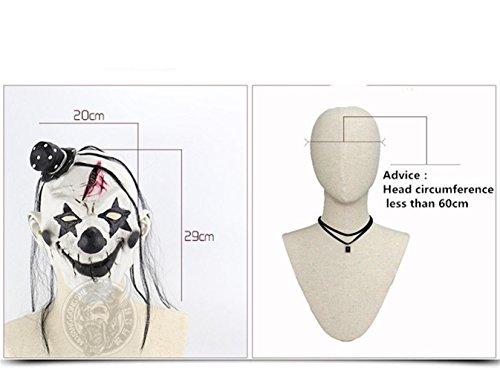 Product Name: Devil ClownItem No. #: M168175sProduct Weight: 115gProduct color: Picture StyleMaterial: Environmental protection latexMask type: Half WigPlease note:Vacuum packaging may cause minor deformation problems. The mask will return to its original shape within a few hours.The slight latex odor is normal, which is harmless. Please put it in a ventilated place one day, the scent disappears.If you are allergic to latex, please don't wear this.Please keep the mask away from the ignition.The color of the image may vary depending on the monitor.To make our masks look more lifelike, we deliberately make the slits of our eyes and mouths smaller. However, if needed, you can improve your eyesight by reprocessing our masks at home and cutting them carefully.