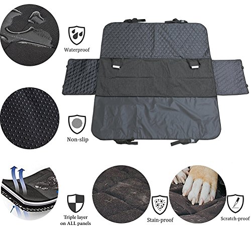 Love your pet, Love your car Taking your furry buddy on a ride but worry about the messes they may leave in the backseat? We've got your covered with the Mega Pet Car Seat Cover. Keeping your furry buddy safer and comfortable while protecting your car seats.Where we go, our furry buddy go too! The Best Choice For Your Car ---Dog seat covers is perfect to protect your car backseat from Dirt, Spills, Scratches, Hair & Fur and other mess, made with waterproof polyester, easy to clean with a damp cloth or just vacuum, Machine Washable. ---Installation is easy and the adjustable hooks and attachments make sure that it will fit any model of car with back seat headrests. In just a few minutes it will be securely fitted and ready to go. ---The car seat cover is designed for all the backseats of standard cars, trucks & SUVs. It also can be act as a fold-in car seat covers with the Velcro strap, suitable for not only small medium large dogs, but also kids, human. Ultimate protection for the back seat of your Car or SUVs Added side flaps on both sides to protect the entire back seat. And the seat belt slits with velcro closures allows the seat belt buckles easily get through and keeps unwanted pet hair out. Just fold the seat cover in half when there is passenger at the back seat. Heavy Duty Material: Plemo pet seat cover made from 4 layers of fabrics: thick water-resistant oxford fabric, cotton layer, 100% waterproof polyester. It fully protects your car seats and footwall areas from pet claws, stains and liquids. Easy to install, Easier to clean: Adjustable straps and clips save your time and energy to assemble with barely hands, no extra tools needed. Special material makes it easy to clean with simple tools like a wet cloth or a vacuum machine.