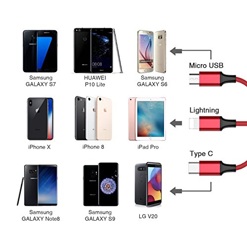 3A High-Speed Charging It supports 3A charge to give your 3 devices more quickly charged at the same time. Speeding up charging by 30%. Nylon Braided In triple-evaporator design, it pays more attention to the reinforcement of wiring. With fine woven wire, the line body is compactly converged, durable and not easy to break. Increased Durability Cable is reinforced with high-quality Woven nylon to give incredible strength Compatibility: 8 Pin Lightning for Apple iPhone X / 8 / 8 Plus / 7 Plus / 7 / 6s Plus / 6s / 6 Plus / 6 / SE / 5s / 5c / 5, iPad Pro / iPad Air / Air 2 / iPad mini / mini 2 / mini 4 / iPad 4th gen / iPod Touch 5th gen / iPod nano 7th gen. Micro USB for all Android and Windows Phones, Tablets, including Samsung / Nexus / HTC / Motorola / Nokia / LG / Sony / Blackberry / PS4 / Xbox / GoPro / GPS Devices / Bluetooth Speakers / Wireless Keyboards / Cameras Support Quick Charge 2.0. USB Type C for Galaxy Note8, S8 S8+, A3 A5 A7 A9(2017), Huawei P10+, P9 P9 Plus, Mate10 Mate 9 Pro, Honor View 10 Google Pixel 2, LG V30 G6 G5, OnePlus 5T 3, Lumia 950 XL Lumia 950, HTC U11 10, Sony Xperia XZ, Xiaomi 5 5 Plus MIX 2 NOTE: THE CABLE IS NOT SUPPORT DATA TRANSFER Warm Tips: When you charge 3 Mobiles at the same time, we suggest you use the charging adapter output current above 2A. When you charge 2 Mobiles and 1 iPad at the same time, please use the charging adapter output current above 2.4A.