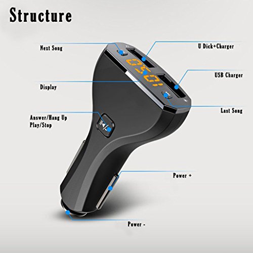 [Product Introduction] The Jayboson Car Charger & Bluetooth FM Transmitter, Lets you stream music and calls directly from your Bluetooth device to your car FM stereo system. The built-in microphone provides you with an amazing hands free function, it also features a USB that lets you steam your favorite MP3 tunes to your car's stereo system and charge your phone simultaneously. The Bluetooth chip can be used with a wide range of device which can make can your driving more interesting. [Features] 1. Wirelessly transmit phone call from mobile phone to car FM Stereo system 2. Switch to Hands-free mode automatically from music playing status when receiving call 3. Built-in Microphone 4. Supports music playing from USB 5. Detect and display the voltage of Car Battery when power on 6. Full 206 channels optional from 87.5-108.0MHz 7. Supports 12-24V 8. Charging Output: 5V/2.4A 9. With Voice prompts 10. Incoming call number announcement 11. Supports last call redial [Specifications] - Bluetooth version: JL 2.1 - Bluetooth Protocol: AVRCP,HFP,A2DP - Screen Display: Yellow LED digital display - Frequency range: 87.5-108.0MHZ - Frequency stability: ±10ppml - Product Input: 12-24V - Charger output: 5V/2.4A - Music Format: MP3 - Mic: ?4.0MM*1.5MM - USB(Max capacity): 32GB - USB : FAT32 - FM Transmit Distance: about 5 m - Product Weight: 56g - Product Dimensions: L80.4 * W42.87 * H20.56 mm - Material: ABS+Black nickel plating [Package contains] 1 x Bluetooth FM Transmitter 1 x Product Manual