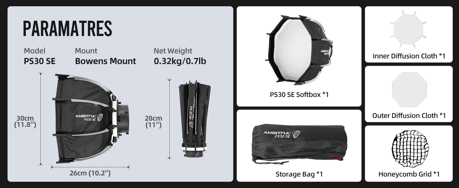 The AMBITFUL 11.8'' Mini Softbox is a professional-grade, octagonal lighting modifier featuring quick-release folding ribs, dual diffusers, and a honeycomb grid for superior light diffusion and control. Compatible with Bowens mount studio lights, it’s ultra-portable at just 0.9lb and folds compactly for easy transport, ideal for photographers seeking flawless, soft lighting on the move.