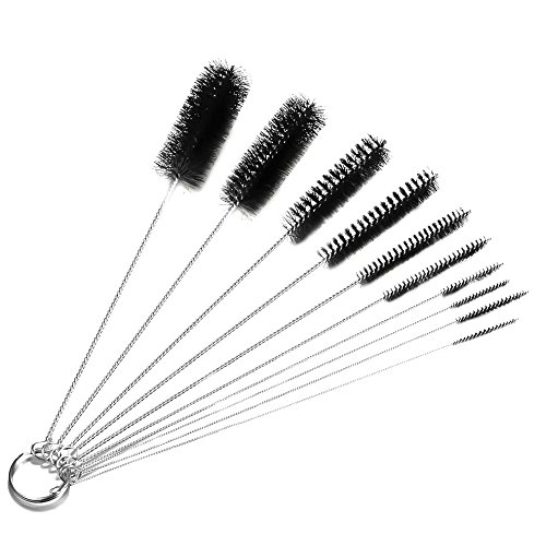 Alohha Bottle Brush, 8.2 Inch Nylon Tube Brush Pipe Cleaning Brushes for Narrow Neck Bottles Cups with Hook, Set of 10 This set of brushes consist of twisted handle rod and nylon brush with the diameter of 2, 3, 4, 5, 6, 8, 12, 16, 20, and 24 mm (1/16, 1/9, 1/6, 1/5, 1/4, 1/3, 1/2, 2/3, 3/4, and 1 inches). All brushes are 8 inches long, dishwasher safe, and constructed with stainless steel and nylon bristles. Perfect for:Bottles/Colanders/Dishes/Drinking Straws/Drip Tips/Espresso Machines/Glasses/Glass Droppers and Dropper Bottles/Guns/Hummingbird Feeders/Jewelry/Keyboards/Paint Spray Guns/Pipes/Pressure Cookers/Sewing Machines/Sippy Cups/Small Nozzles/Tattoo Equipment/Thermal Coffee Tops/Tubes/Vaporizers/Water Pumps/Baby products, ect. Easy to clean, will not rust.More uses waiting for you to discover ,Including the kitchen, daily life and industrial applications . Notice: - After use, be sure to rinse the brush well and dry it before storing it. - If the bristles bend, they can be straightened when the brush is dipped in hot water for several minutes. - Keep away from fire.Use only for intended purpose. Specifications: Item Weight: 41 g 10 Diameters: 1/16, 1/9, 1/6, 1/5, 1/4, 1/3, 1/2, 2/3, 3/4, and 1 inches Material: Nylon, Stainless Steel