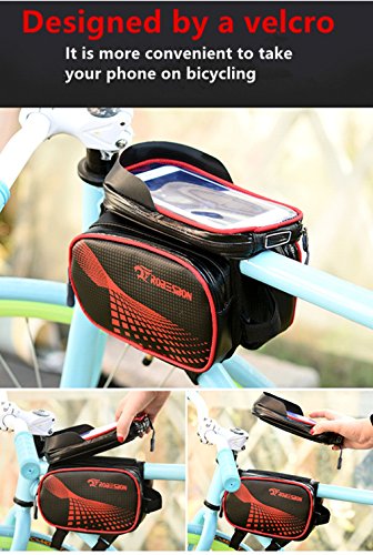 Specifications Material: TPU touch screen, PU fabric of the pocket Size of the screen: 6.2inch Waterproof level: Life and rain resistant Compatible phone size: Any size under 6.2inch mobile phone, such as ompatible phone , Iphone 6s, Iphone7, Iphone7plus,Iphone8,Iphone X, Samsung Galaxy S7,Galaxy Samsung 8,Moto G4 Plus, Huawei mobile phones and so on. Bigger Capacity There are two pocket on both sides, it is enough big to place wallet, key, power bank, gloves, bike repair tools and other items More Stable There are three Velcro strap fixed on the top tube. It will be more stable to fix it. Reflective on night cycling It is made of reflective material on the edge, it can be reflective on night to ensure your safety. High Sensitive TPU Touch Screen Made of the sensitive TPU material, allows you to touch your phone to pick phone or answer it without take the phone out. Note: 1. Because of the waterproof design, The zipper will be a bit tight, not quality issue, please do not worry about this. 2. This bike bag is more suitable for thicker frame, it fit on the fat bike better.(If your bicycle frame is small, place a towel or cloth underneath your bike bag so you can fit it more securely fixed on your bike.)