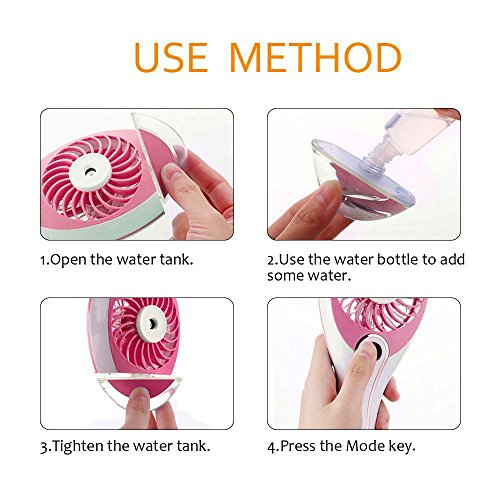 Specifications: 1. Item type:Handheld USB Misting Fan 2. Color:Blue Green Pink 3. Power input: DC5V 4. Working current: 250mA(Fan); 350mA(Misty); 600mA(Fan+Misty) 5. Battery specification:3.7V/1200mA (Built-in 18650) 6. Charging time:4 hours 7. Working time: 3.5 hours for fan, 2.5 hourrs for misty and 1.5 hours for fan+misty. 8. Water capacity:23ml 9. Net weight:175g 10. Unit Dimension:90x44x191mm Application: 1. Please use the bottle to inject water, don't let it overflow 2. The battery should be fully charged before storage. 3. Don't put anything into the fan when it is working. 4. Please use USB/DC 5V power for charging. Package include: 1 x Rechargeable portable mini misting fan spray water fan 1 x USB cable 1 x Water bottle 1 x User's manual