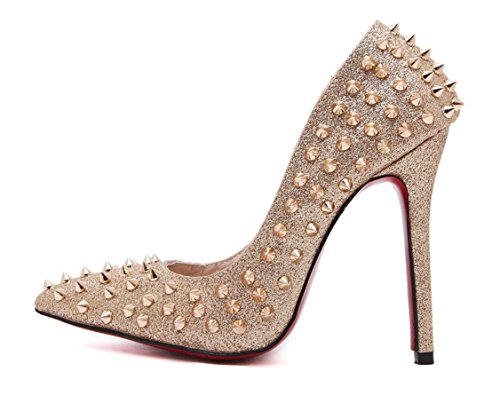 Popular elements: rivetToe shape: pointedUpper material: artificial PUApplicable gender: femaleHeel height: ultra high heel (above 11CM)Suitable for the season: winter, spring, summer, autumnSole material: PUInner material: imitation leatherHeel shape: fine withSole Technology: Sewing ShoesInsole material: PUColor: Gold, SilverSize: 35, 36, 37, 38, 39, 40