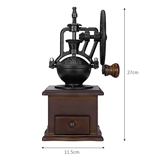 ❤Premium Coffee Mill Grinder Expertly constructedand artfully designed, this vintage mill handles a variety of grinding jobsbeyond your everyday coffees and espressos. Use it for dry spices,herbs, nuts, and other gourmet ingredients. ❤Smooth Manual Cranking Don't bother withmessy, complicated grinders. This crank style millrequires just a few turns on the handle and you're soon ready to brew up somegourmet coffeehouse specialties. Also makes a wonderful conversationpiece. ❤Grinds Exceedingly Fine-Or Coarse Whether you need extrafine finish for your drip machine or coarser texture for a French press, theunit's top parts easily screw off so you can select your setting. Simply rotate the cognut to achieve a range of grind finishes. ❤Charming Old-World Design Forget bulky eyesoresof appliances. This machine oozesantique charm with its red wood base and durable cast iron mechanisms. The pedestal's built-indrawer also offers a smart solution for collecting grounds. ❤Makes Coffee House Quality Preserve beans' naturalflavor, aroma, texture, and oils with a machine that doesn't produce heat orother pollutants. You'll enjoy cup aftercup of smooth every day of the year.