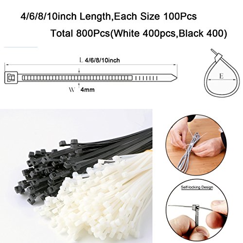 Specification 【Super Binding Strength】 Nylon Zip Ties Support up to 60 pounds of weight 【Premium Materies】Anti-acid,Anti-corrosion,UV Resistant. 【Self-locking Design】Sawtooth Antiskid & Locking design,adjustable and easy to use 【Widely Used】 Cable ties can be used for tying cables, plants, packages, etc. It's a great tool in home, office, garden and workshop.agriculture,horticulture,small handmade art,garage and workshop tidy. 【Package】 1000 zip ties including: 4/6/8/10/12 inches (each size 200 pcs). Width 4mm/0.157inch Note 1. Please kindly cut cable ties with scissors or knifes instead of pulling them with hands. 2. Please kindly note that cable ties should be kept out of reach of children. 3. Please kindly note that cable ties should be used in proper temperature and tension. Package 1. 100 × 4 Inches Cable Ties in Black,100 × 4 Inches Cable Ties in White 2. 100 × 6 Inches Cable Ties in Black,100 × 6 Inches Cable Ties in White 3. 100 × 8 Inches Cable Ties in Black,100 × 8 Inches Cable Ties in white 4. 100 x 10 Inches Cable Ties in Black,100 ×10 Inches Cable Ties in White