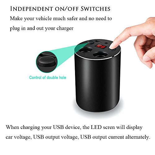Sourcingbay Cup Design 2-Socket Cigarette Lighter with Dual USB Ports Smart Car Charger It never fails when you are driving down the road and everyone phones need charged at the same time. Product Features: 1.TWO 12V/24V CIGARETTE LIGHTER SOCKETS can used to power your GPS, dash cam, cooler boxes and simultaneously use of multiple car appliances. 2.INDEPENDENT ON/OFF SWITCHES control the two cigarette lighter separately. Make your vehicle safer with it and you can leave everything plugged in and just press a button when getting in or out of the car. 3.DUAL USB CAR CHARGER built in smart charging IC with 3.1A total output, automatically detect usb devices current and provide relative enough current to USB devices so can achieve rapid and safety charging. 4.INTELLIGENT CIRCUIT DESIGN built-in safeguards prevent the cup charger and your devices from overheating and overcharging. Specifications: -Input: DC 12-24V -Output: DC 5V/3.1A(max) -Retractable Power Cord Length:19.7 inch(50cm) -Dimensions: 3.82 x 2.76 x 2.76 in / 9.7 x 7.0 x 7.0 cm -Weight: 6.8 oz /195g Friendly Note: ? Compatible with car from 12V~24V only, please do not try other range vehicle. ? This charger provide a total power up to 80W, please don¡¯t connect any device over this power. ? Cigarette Lighters don't support cigar lighter function. It is designed to power consumer electronics. ? Phone charging cable,cellphone, pc, tablet,car and others are NOT included. Package: Cup Car Charger x 1 24 Hours after-sale service x 1 We stand by our products 100% with a 12-month warranty.