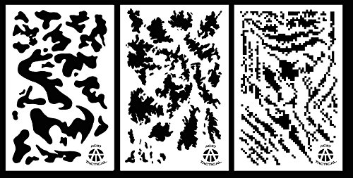You will receive one of each of the three camouflage stencils pictured. Army Camo, TACS, Tiger Stripe Digital. For use with airbrush, spray, gun coatings, duracoat, cerakote, and other spray paints. 10 Mil flexible sheet Multiple overlay patterns Washable with solvents or water.