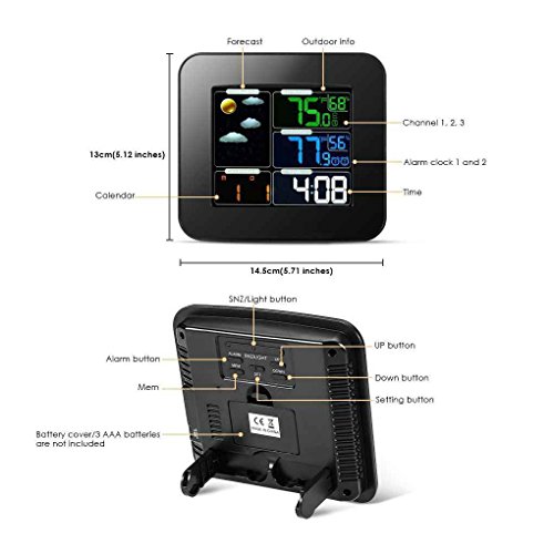 Description:Color backlight: LCD screen has color backlight function, which can bring you uniform light source to protect your eyes.The color weather station shows you time, date, indoor and outdoor temperature and humidity, forecast weather, helping you prepare in advance.With colorful LCD screen, this weather station forecasts five kinds of weather: sunny, half sunny, cloudy, rainy, stormy. The image reports are vivid and clear.Application: The wireless sensor installs just about anywhere to report on conditions in the greenhouse, garage, wine cellar or baby's room, places where proper temperature and humidity levels are crucial.Specifications:Material: plastic.Size (Main unit): 14.7*2.6*13.3cm.Size (Remote sensor): 4*2.25*10.8cm.Color: show as pictures.Indoor temperature scope: -9.9℃--50℃.Indoor humidity range: from 20% to 95%.Outdoor temperature scope: -50℃--70℃.Outdoor humidity range: from 20% to 95%.Temperature Resolution: 1℃.Humidity Resolution: ±1%RH.Summertime setting.Low Battery indicator.Led backlight.Power supply of receiver: 3 x AAA battery ( not included ) or adapter (included).Power supply of transmitter: 2 x AA battery ( not included ).Notes:Due to the light and screen setting difference, the item's color may be slightly different from the pictures.Please allow slight dimension difference due to different manual measurement.Package include:1 * Indoor Receiver.1 * Outdoor Transmitter.1 * Power Adapter.1 * User Manual.