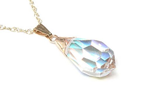 AB Crystal Teardrop pendant with 9ct gold fittings. Dimensions: 20x10mm AB Crystal, 25mm total drop (including ring bail). Complete with 9ct gold 18" Prince of Wales chain. Matching earrings also available. Suitable for use as a charm or pendant. Made in England. Presented in a luxury gift box - Great Gift!!
