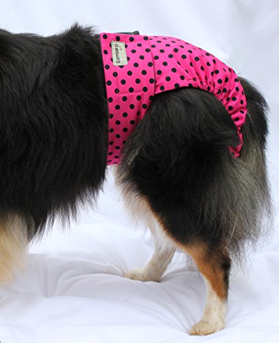 Premium PUL Fabrics / lined with microfleece. Size LARGE - fits waist from 18" (46cm) to 21" (53cm) Types of dogs suitable for: Boxer, Standard Poodle, larger Staffies, smaller Labradors, Dalmation within the specified waist measurements. Please measure as dog breeds can vary in size. ***Dogs demonstrating product in listing photos are wearing our size Large in various styles**** Please measure your dog's waist as breed can vary in size/type. Can be used with our own brand Popper pads (available in separate listing) or disposable pads Made from premium breathable waterproof fabric - the outer layer is P.U.L (polyester/polyurethane laminated knit fabric) - this fabric is used in nappies for babies. They are lined with very soft, top quality stay dry microfleece - which is a very lightweight but dense fleece which helps wick away and absorb moisture. This product is designed exclusively to help cope with a urine incontinent or leaky female dog and is based on our popular comfy Season pants. Can also be machine washed up to 30C - tumble dry on low heat - no fabric softener. If you decided to use disposable pads with the product - you will need to buy sanitary towels/panty liners to place in the part that goes between the legs. Use the type of pad (thickness) you feel is most suitable for your girl. We send the products out with a disposable pad to get you started and for the benefit of trying the product on your dog to ensure it fits correctly. ****Remember: you will need to regularly check to see if the pad needs changed/washed****